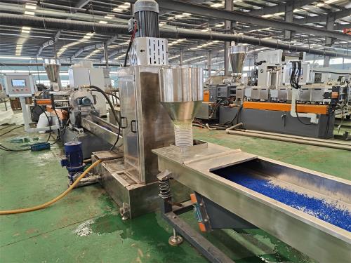 雙螺桿水環(huán)造粒機_比同類產(chǎn)品省電15%_佳德塑機JDL-75D雙螺桿水環(huán)造粒機組一、系統(tǒng)機組技術(shù)參數(shù)Ⅰ、機器顏色:主機為公司標色;電柜為電腦色Ⅱ、造粒工藝:(上輔機----高混機)另外配置----雙螺桿計量式喂料——-JDL-75D雙螺桿擠出機----——液壓板式換網(wǎng)——水環(huán)熱切模頭------水泵-----離心脫水機------2.5米加長振動篩-----一級旋風(fēng)分離器-----風(fēng)冷成品料倉----- -主機采用:PLC控制Ⅲ、作業(yè)物料:POE+PE+PP+35%鈣粉+35%硫酸鋇 產(chǎn) 量:800-1000公斤/小時(作業(yè)條件不同,產(chǎn)量稍有不同)雙螺桿水環(huán)造粒機_比同類產(chǎn)品省電15%_佳德塑機客戶為何購買我們設(shè)備,我們價位在行業(yè)屬于中低價格,我們設(shè)備能給客戶帶來哪里利益,我們設(shè)備能給用戶帶來以下利益:1.特點:這套設(shè)備主機是環(huán)保型;主機設(shè)備不需要接外循環(huán)水系統(tǒng);自帶循環(huán)冷卻統(tǒng)是我公司專利產(chǎn)品,2.雙螺桿齒輪箱冷卻采用:采用環(huán)保冷卻系統(tǒng)(環(huán)保型:發(fā)明專利號:CN201911312134.6)不需要接外循環(huán)水冷卻,不用徘外水;采用閉環(huán)循環(huán)系統(tǒng),不用擔(dān)心長時間使用水冷卻會產(chǎn)生水垢把冷卻器堵住,導(dǎo)致齒輪箱損壞3.雙螺桿主機水箱冷卻系統(tǒng)采用:采用環(huán)保冷卻系統(tǒng)(環(huán)保型:發(fā)明專利號:CN201911312134.6)不需要接外循環(huán)水冷卻,不用徘外水;采用閉環(huán)循環(huán)系統(tǒng)4.水循環(huán)真空泵,電機功率:2.2KW,真空泵采用環(huán)保冷卻系統(tǒng)(環(huán)保型:發(fā)明專利號:CN201911312115.3)不需要接外循環(huán)水冷卻,采用閉環(huán)循環(huán)系統(tǒng)5.節(jié)能:普通筒體筒體冷卻;例如:第5區(qū)溫度超高;這是電子閥導(dǎo)通;第5區(qū)冷卻回水就會影響第六區(qū)和第四區(qū)的溫度下降;就會導(dǎo)致第四六區(qū)加溫;這種情況會一直循環(huán)出現(xiàn);導(dǎo)致電費浪費;我們現(xiàn)在采用環(huán)保型就徹底解決這個問題;加我們委托第三方開發(fā)溫控模塊,溫控加熱系統(tǒng)比同類設(shè)備節(jié)能:10-20%電費,就是每噸能為客戶節(jié)省電費10元,每年大概能節(jié)約電費3萬6.雙螺桿齒輪箱采用高扭:D型齒輪箱