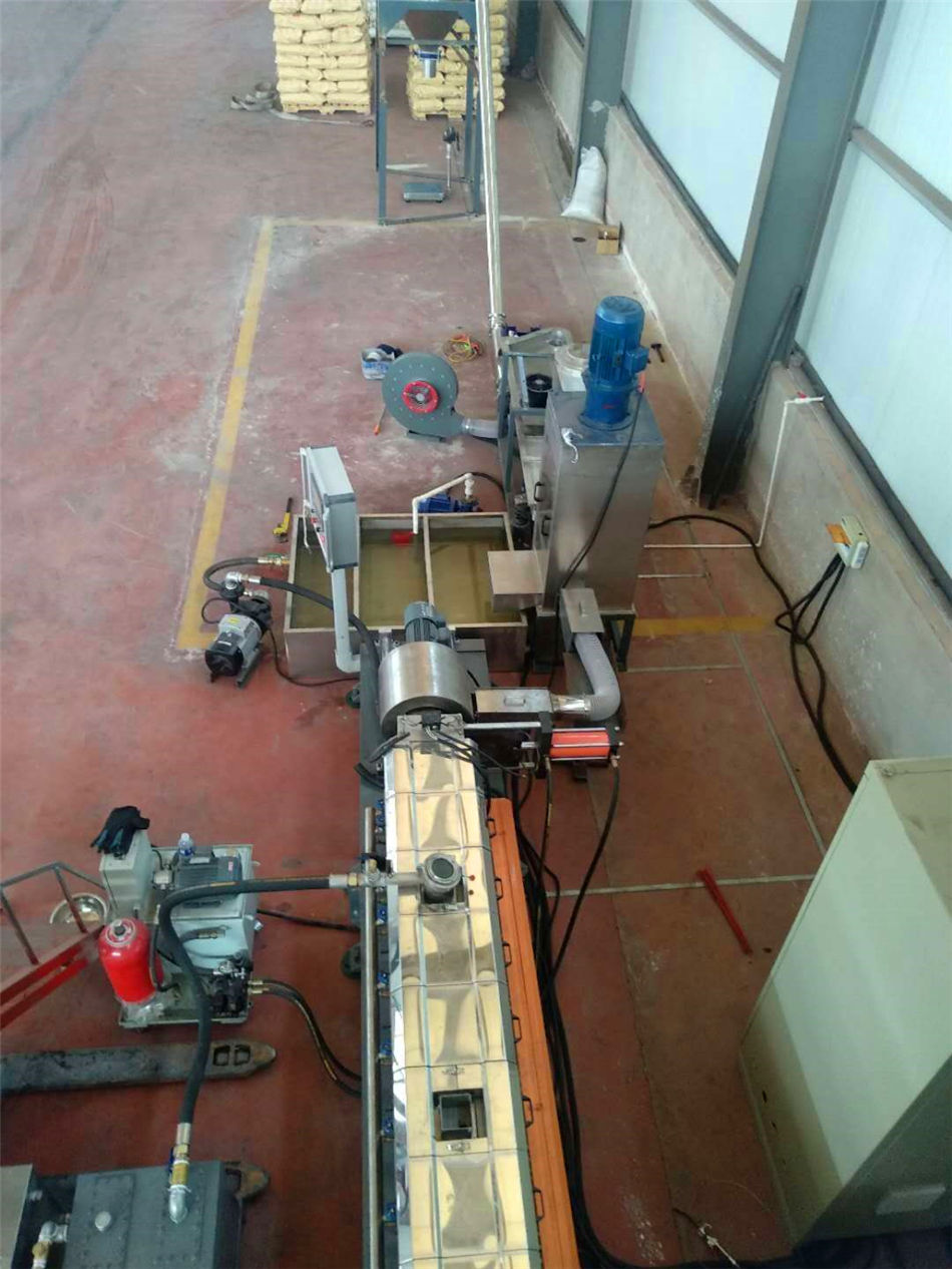(三)水拉條輔機(jī) 1)水槽:一臺(tái),L=6米,加寬加深,槽體為不銹鋼材質(zhì);水槽與吸干機(jī)過(guò)度體一件;不銹鋼材質(zhì),水槽熱水經(jīng)過(guò)濾器到環(huán)保型冷卻器;水槽架里安裝:4組環(huán)保風(fēng)冷卻系統(tǒng)(環(huán)保型:發(fā)明專利號(hào):CN201911312134.6)不需要接外循環(huán)水冷卻,不用徘外水;采用閉環(huán)循環(huán)系統(tǒng); 2)吹干機(jī):一臺(tái),功率1.5kw;與物料接觸件均為不銹鋼材質(zhì)。3)龍門切粒機(jī):壹臺(tái),功率4kw,變頻調(diào)速;切粒機(jī)動(dòng)刀刀口采用鎢鋼材質(zhì)4)加長(zhǎng)振動(dòng)篩:一臺(tái),L=2.5m,電機(jī)采用:震動(dòng)專用電機(jī);震動(dòng)量可以調(diào)節(jié)大小:電機(jī)功率率:0.55KW兩臺(tái);振動(dòng)篩篩網(wǎng)采用三層分離物料;大孔直徑φ8mm,小孔直徑φ2.5mm,不銹鋼材質(zhì),振動(dòng)篩出廠時(shí);振動(dòng)量調(diào)節(jié)到最??;5)風(fēng)吹料倉(cāng):一套,1m3料倉(cāng)一件,不銹鋼材質(zhì);采用φ130mm不銹鋼管聯(lián)接;3kw物料輸送風(fēng)機(jī)。雙螺桿塑料造粒機(jī) http://ywkzsh.com/contents/13/79.html