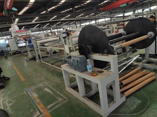 Ⅱ、擠出工藝:(三顆粒一粉三油六小料配料系統(tǒng)---高混機(jī)---緩存箱)另外報(bào)價(jià)------單螺桿計(jì)量式喂料——-JDL-75B雙螺桿擠出機(jī)---——液壓板式換網(wǎng)系統(tǒng)------片材擠出模具-----三輥壓光------三輥冷卻系統(tǒng)----下覆膜裝置----托架冷卻------切邊裝置----冷卻牽引-----10米緩存區(qū)-----自動糾偏系統(tǒng)---三輥輸送帶----計(jì)米器------飛切系統(tǒng)-----單臂收卷機(jī)(推出功能)四個(gè)開袋系統(tǒng)------輸送帶平臺------主機(jī)采用:PLC控制