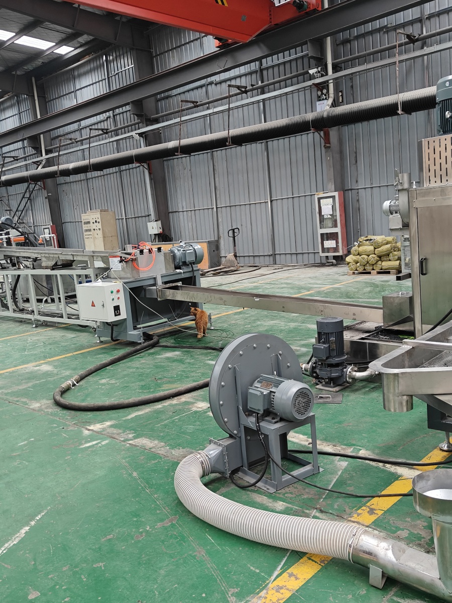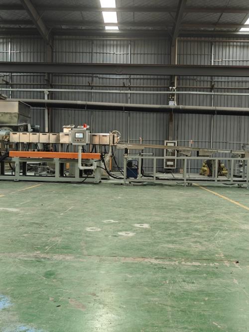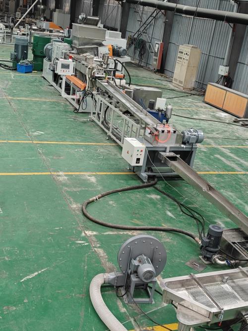 Ⅱ、造粒工藝:(2噸塔式烘干機2臺-----螺旋上料機----金屬分離器)客戶自備------單螺桿喂料機——-JDL75D雙螺桿擠出機---—液壓板式換網(wǎng)——拉條機頭----5米不銹鋼水槽-----水沖龍門切粒機-------離心脫水機-----2.5米不銹鋼振動篩-------風(fēng)冷成品料倉----噸袋自動稱重系統(tǒng)------主機采用:PLC控制