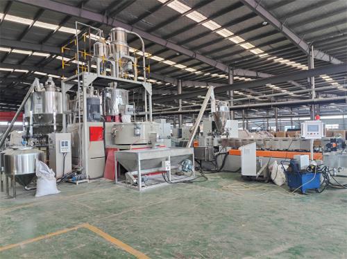 Ⅱ、造粒工藝:(500升高混機------螺旋上料機)客戶自備-----雙螺桿計量式喂料——-JDL-75D雙螺桿擠出機------液壓板式換網(wǎng)——--液壓柱式排料裝置------水下切模頭------水泵------15米不銹鋼冷卻水管-----離心脫水機------2.5米加長振動篩----一級旋風分離器-----風冷成品料倉----采用:PLC控制